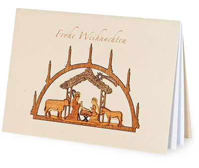 Das Aufstellen des Schwibbogens ist längst nicht mehr nur im Erzgebirge eine liebgewonnene Tradition. Pünktlich zu Beginn der Adventszeit erstrahlt er hell auf den Fensterbänken. Ursprünglich aus Metall geschmiedet, ist er heute meist ein begehrter Holzschmuck. So ziert auch diese hochwertige Holzintarisen-Klappkarte ein weihnachtliches Schwibbogen-Motiv, das sich aus vier unterschiedlich farbigen Hölzern zusammensetzt.